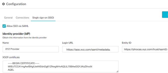 In the Phocas menu, click Administration > Configuration, then click the Single sign-on (SSO) tab.