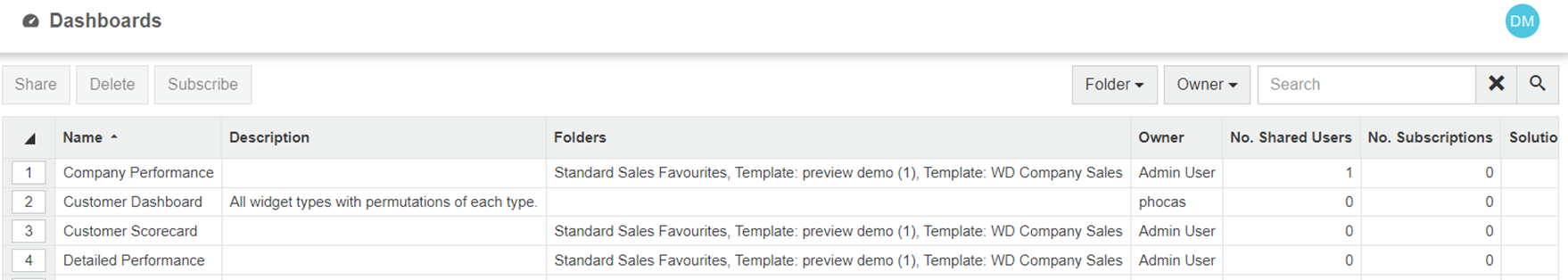 Click **Administration** > **Dashboards**. The **Dashboards** page displays a list of all your dashboards, including those you created and those that were created by other users. You can see details such as the folder in which the dashboard was created and the user who created it (owner). You can also see the last time the dashboard was opened, which is useful when deciding if it can be deleted. You can filter the list by **Folder** or **Owner** or search for a specific dashboard.