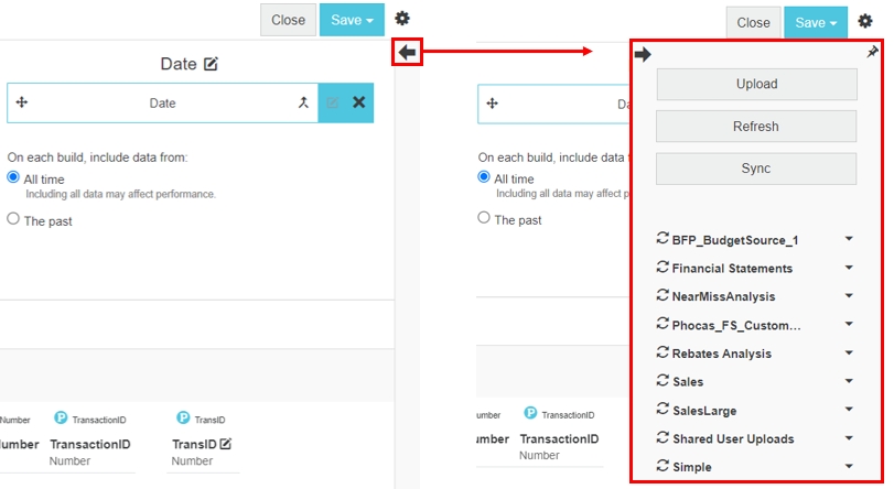 The Design tab has two modes, Stream and Dimension, and these modes look similar. They are divided into five sections, as identified by the numbers 1 to 5 in the images below and outlined in the table. These panels correspond to the components of your database and this is where you add, then map, the various columns of data to their structure in Phocas. The Design tab also has the data sources panel (number 6 in the images), which slides out from the right side of the screen.