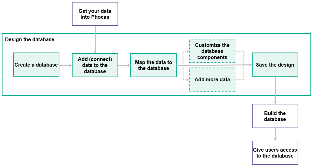 The image and steps below outline the basic process of designing a database in Phocas (green steps). As you can see, there are some steps (purple) that you need to take before and after the design process.