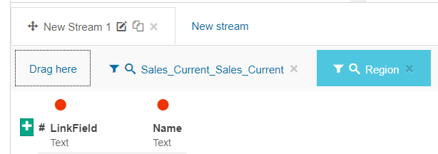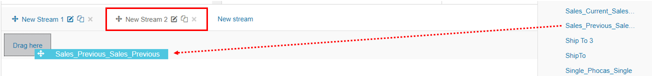 Expand the data sources panel and locate the required item, then drag the item into the Drag here box in the new stream tab.