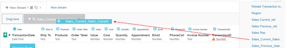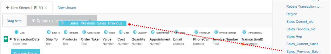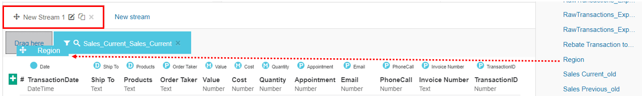In the data sources panel, locate the transaction file and drag it into the Drag here box in the New Stream 1 tab.