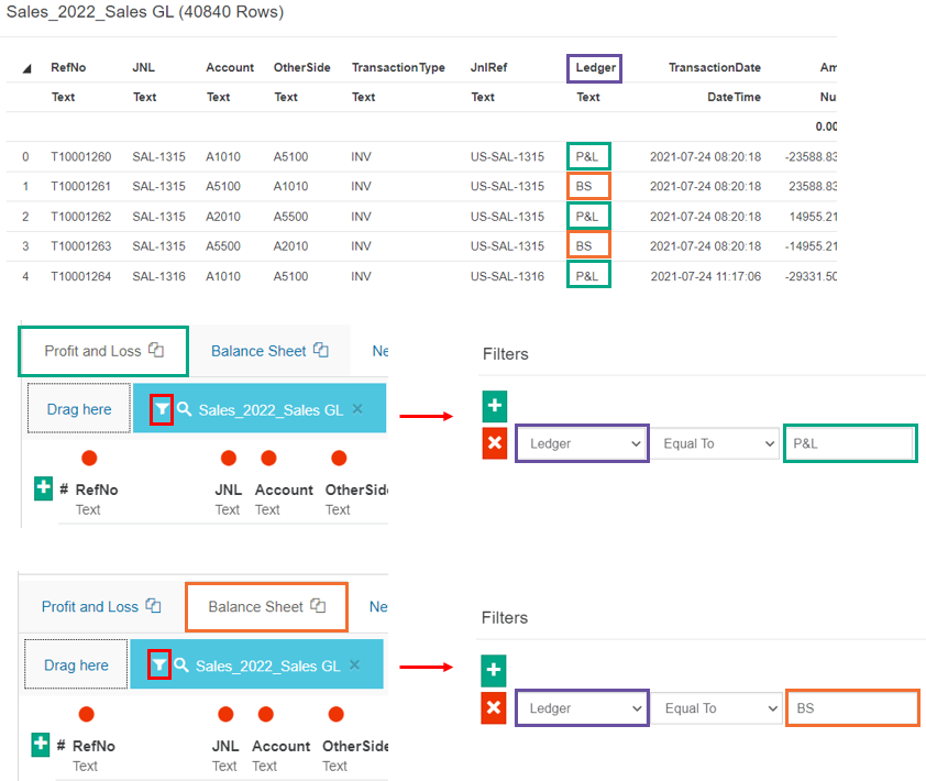 Suppose you have a financial database in which Stream 1 has a General Ledger file with Balance Sheet and Profit and Loss transactions. You can clone that stream (see section above), then filter Stream 1 to display only the Profit and Loss transactions, and filter Stream 2 to display only the Balance Sheet transactions.