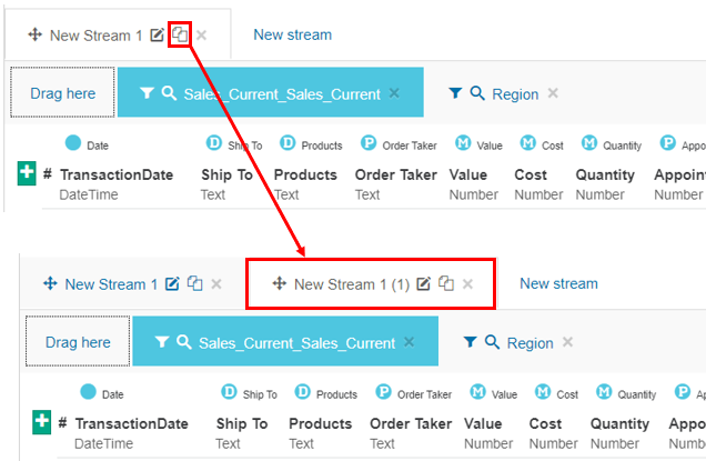 In the Stream tab header, click the Clone button. The new stream tab (clone) displays on the right of the original tab, with a 1 appended to its name. The new tab is automatically open, ready for you to make your changes.