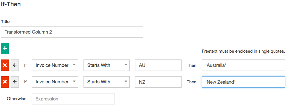 The If-Then option is useful for creating advanced transforms without SQL knowledge. These columns are useful for many reasons, such as to clean up source data, where a name has been entered inconsistently throughout: If [Name] Is equal to 'Joe Smith' Then ‘Joseph Smith’ If [Name] is equal to ‘J Smith' Then ‘Joseph Smith’