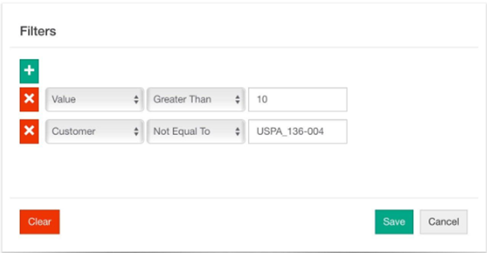The following filter configuration will filter the sales transactions; only transactions with a value greater than $10 will be included and any transactions involving the customer USPA_136-004 will be removed.
