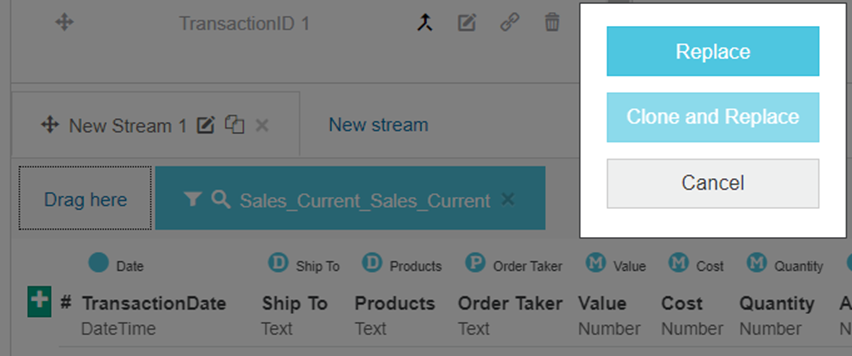 The Clone and Replace option allows you to apply existing mappings to new items that you add to a stream. The items must have the same structure. This option is particularly useful if your design contains a lot of mappings or transform columns that take a long time to set up.