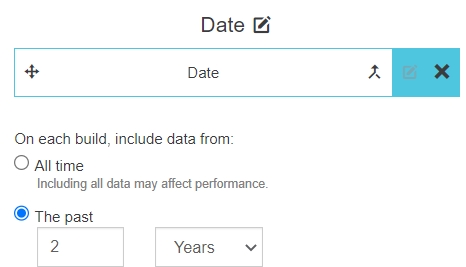 The past - Apply a filter to the historical data to determine how much data is included. For example, you might want to maintain only 2 years or 6 months of historical data at all times. This filter works on the calendar year (Jan - Dec), so the current period is added to your specified timeframe. For example, if you enter 2 Years and today is June, you will get the full two prior calendar years plus the 6 months of the current calendar year.
