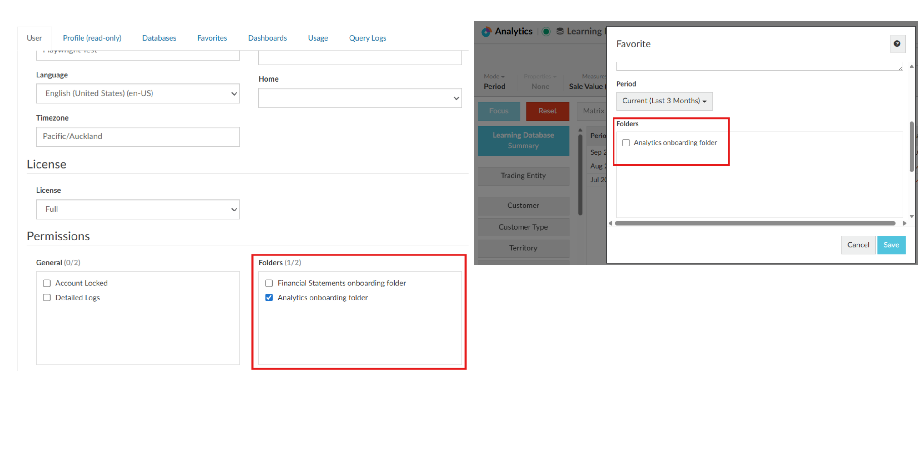 These folders are listed in the [user account page](https://docs.phocassoftware.com/administration/users/add-update-user/user-account-page) > **User** tab (image below left). If you select a folder there, you give the user access to the contents of that folder. Users typically see a list of available folders when creating, sharing or cloning a dashboard or favorite (image below right). They can select one or more of these folders to share the item with other users.&#x20;