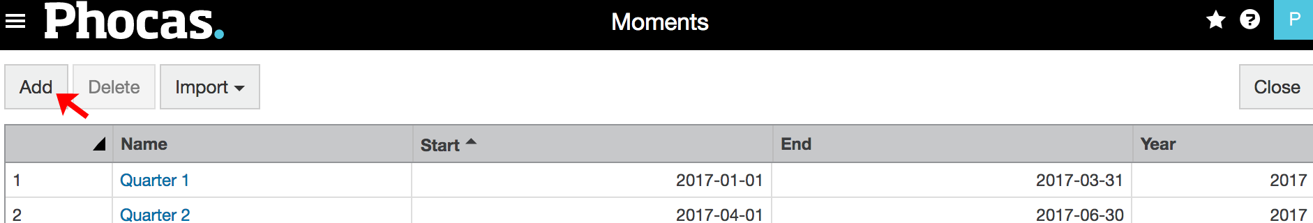 To delete a moment, click the period type to open its Moments screen, then select the moment row and click Delete > Yes.