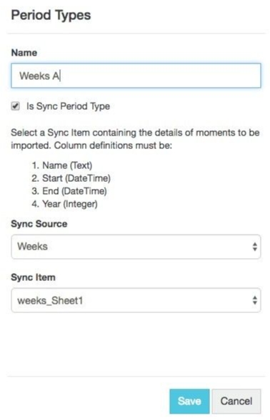 The process of adding a new period type has two key steps. First, you add the period type, then you define each moment in that period, in other words, add the collection of date ranges that make up the period. You can define the moments in three ways; (A) manually enter the moments, (B) import a file containing the moments or (C) base the period type on synced data.