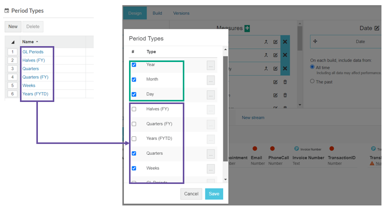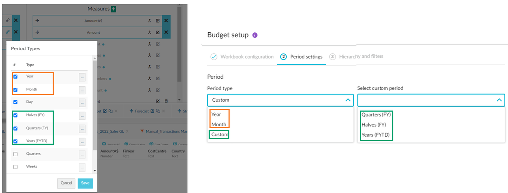 On the right, you can see the corresponding list of period types in the database setup (Date section in Designer), along with the three default period types (in the green box). It is here in the database setup that you determine the period types that are available in the database.