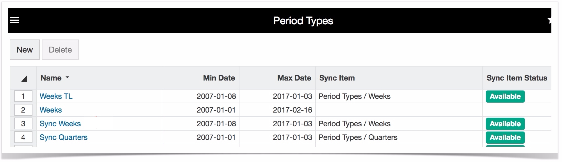 To delete a period type, select the period type row and click Delete > Yes.