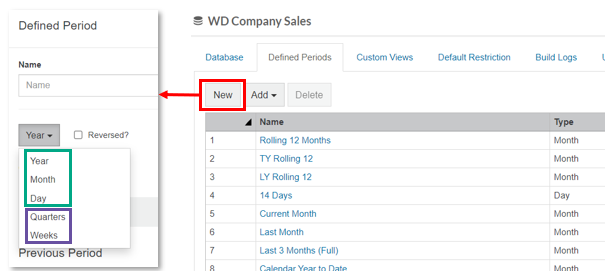 The default period types are Year, Month and Day and you cannot edit or delete these. You can, however, edit and delete other period types, known as custom period types, such as Quarters or Weeks. You can also add more custom period types as required. This difference in period types is explained in the following image: