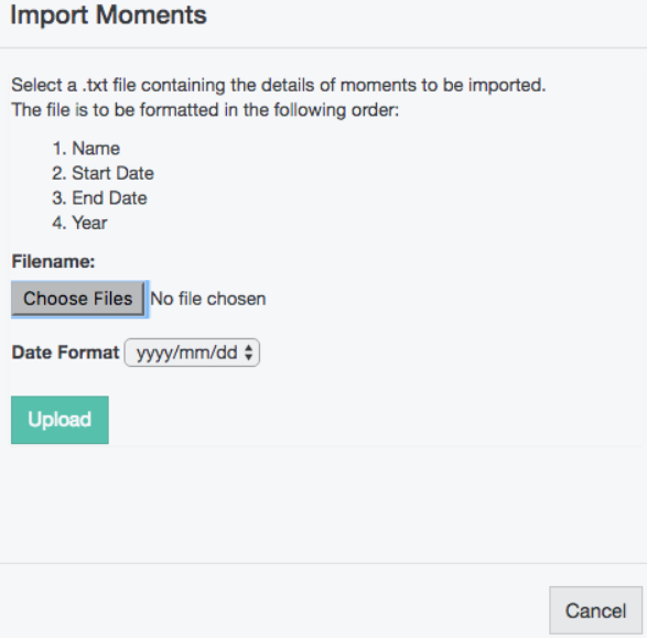 Data in the Year column must be 4 numbers only. If your moment spans a change in year, it is recommended you use the year that matches the Start Date.