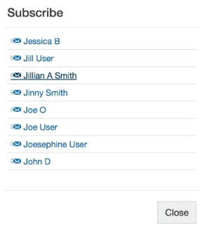 The Subscribe window contains a list of all users who can currently access the favorite*. Users who already have an active subscription are identified by the darker envelope icon.