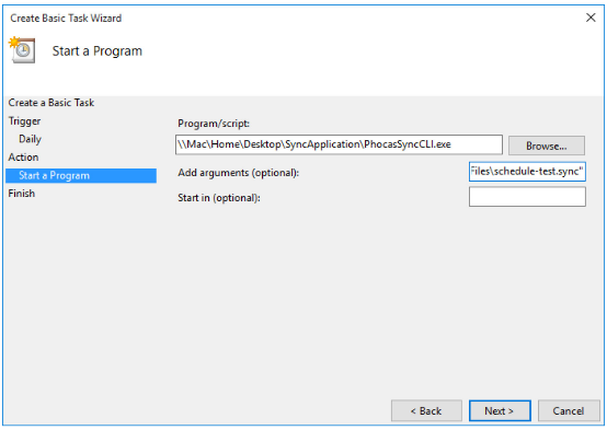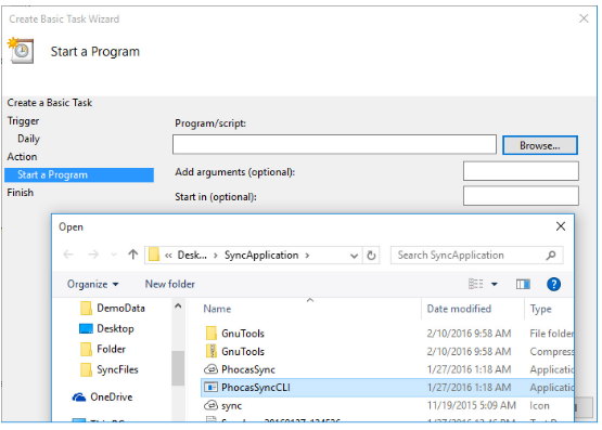 Click Start a program, then click Browse and locate the PhocasSyncCLI.exe file.