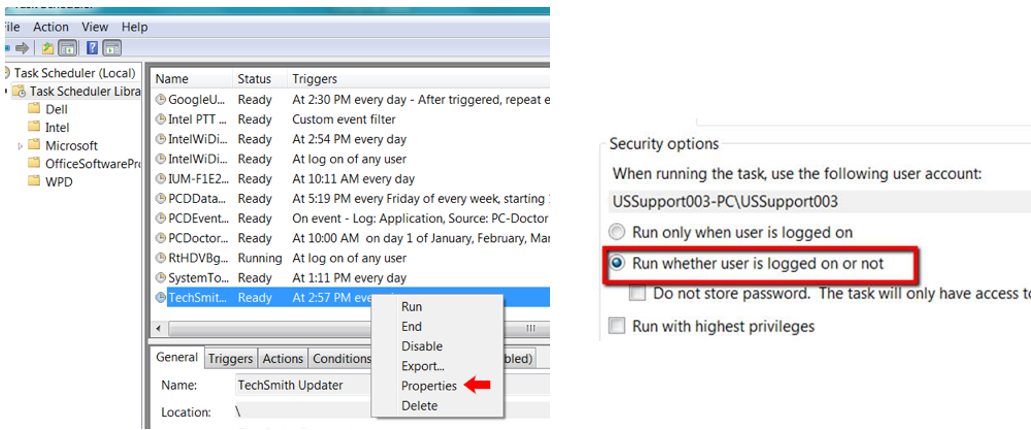 Ensure that the task runs even when you are signed out of Phocas: Locate the task in the list, right-click on the task and click Properties, then on the General tab, select Run whether user is logged on or not and click OK.