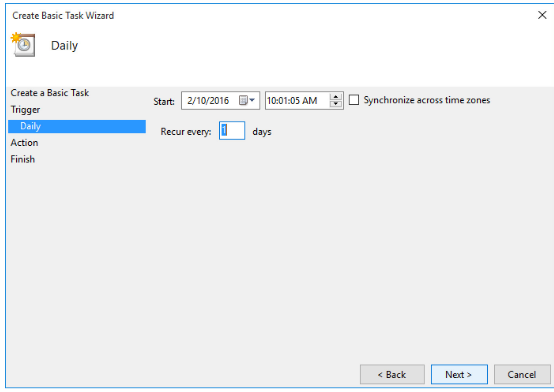 For the trigger, select how frequently you want to run the task. In this example, it will run every day at 10.01am.