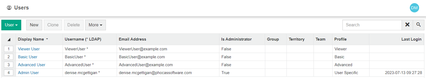 The Users page lists the users whom you have permission to administer, along with details, such as their email address, group, territory, profile, and the time they last logged in to Phocas.