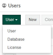You can change your view of the User page to quickly find out information or complete certain tasks related to licenses and databases. Click the green Users button in the top left corner and select the required option, License or Database. You can then return to the User view in the same way.