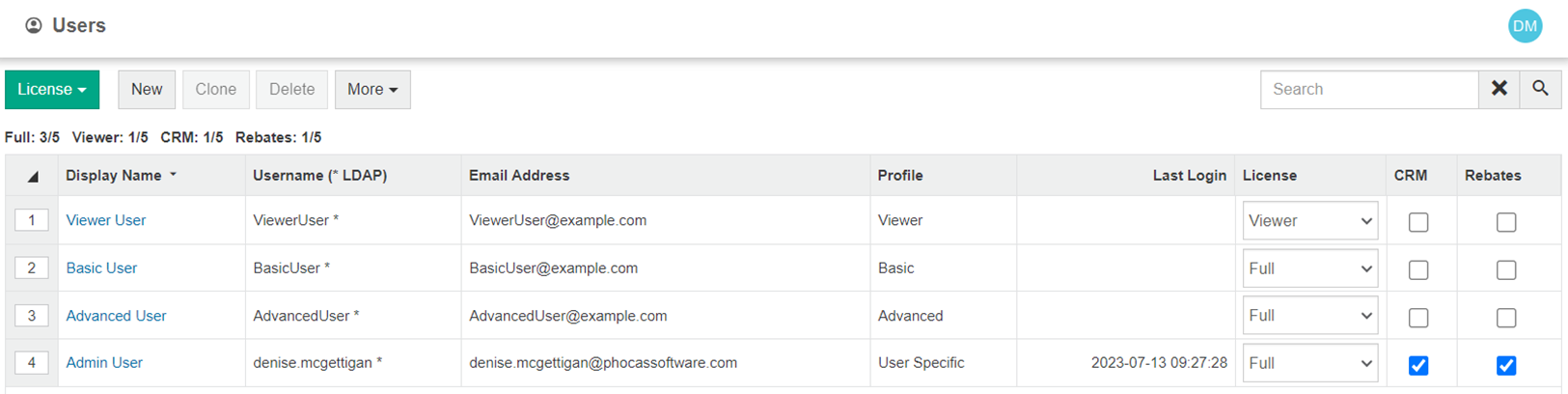 The License view displays the basic user details along with additional columns showing each user's Phocas license type and whether they have a CRM, Rebates or Insights license. Above the grid, you can see the number of licenses (both full and viewer types) that are in use, which is based on the number of users who are entitled to use Phocas under your licensing arrangements. If you are approaching the maximum number of licenses, you can either contact your Phocas consultant about increasing the license count or reduce your user count by deleting users who no longer require access.