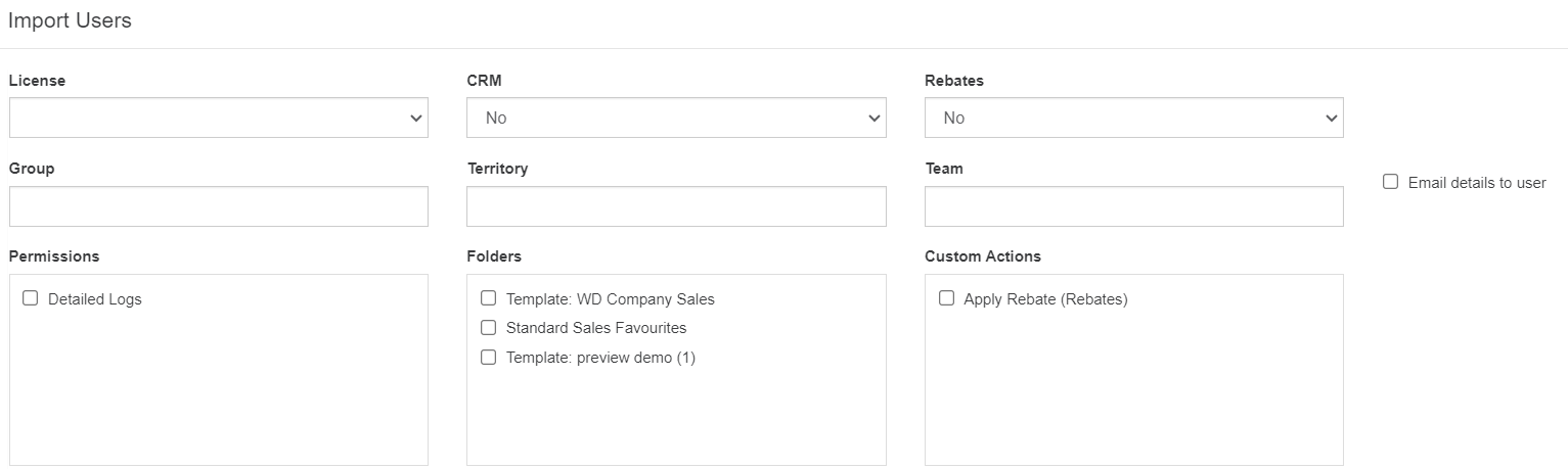 Assign the users to a group, territory and/or team. Unless you have the Users: All Users setting selected in your profile, the Group and Territory fields will automatically be populated with your own group and territory and show as disabled. If you have either Users: Users In Same Group or Users: Users In Same Territory, but not Users: All Users, both Group and Territory will be disabled.