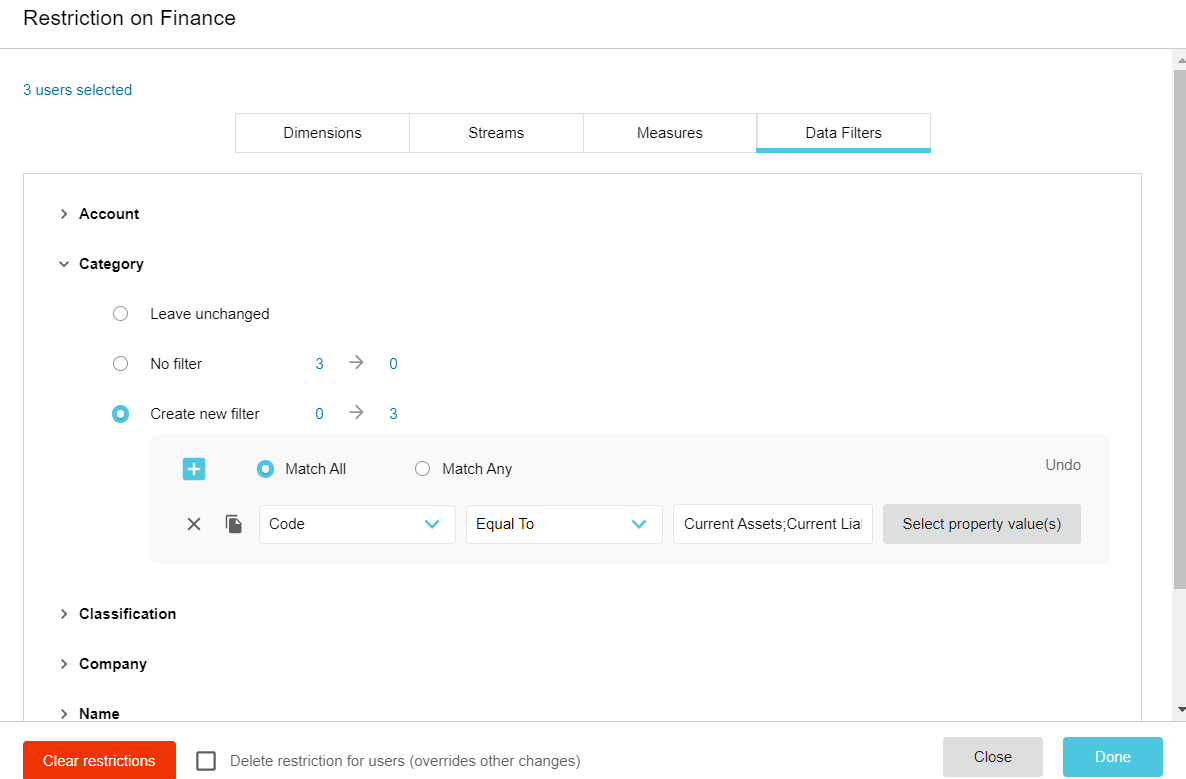 Apply filters to the dimensions: Click the Data Filters tab and expand the dimension for which you want to apply a filter. Select Create new filter, then configure the filter condition as required. Click the blue plus button to add another filter condition, if required.
