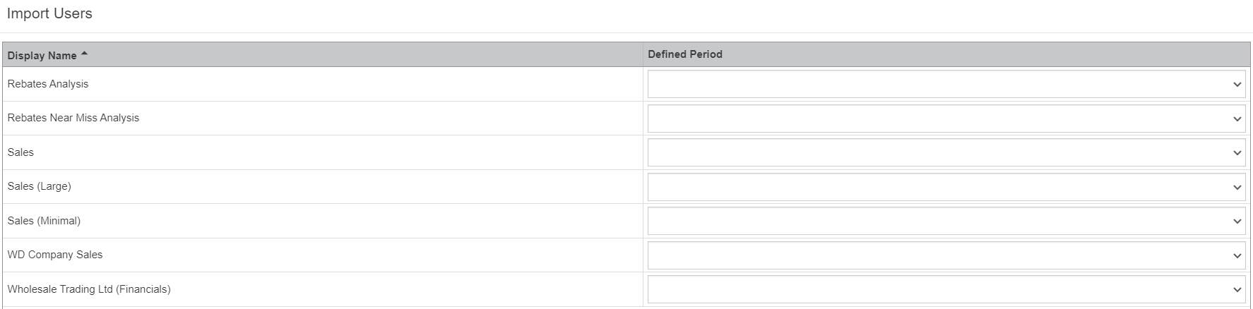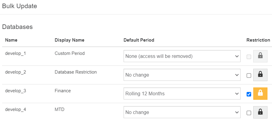 To remove access to a database, select the None option from the Default Period dropdown list.