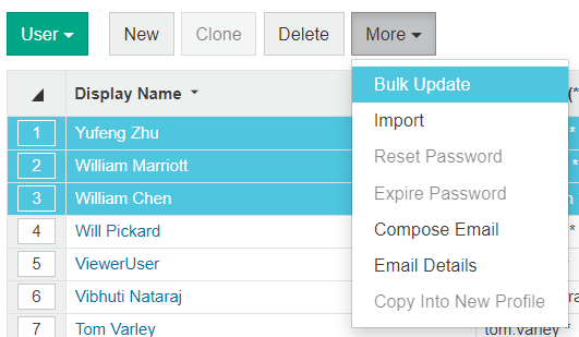 On the User page, select the users for whom you want to update details and click More > Bulk Update.