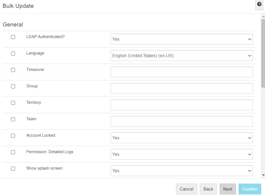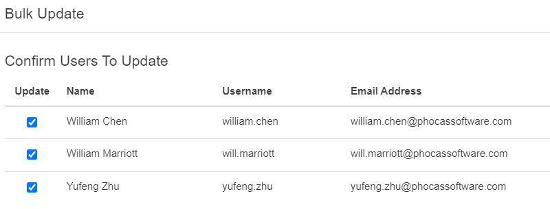 On the Bulk Update screen, ensure you have selected the correct users (clear the checkboxes of any users you do not want to update) and click Confirm.