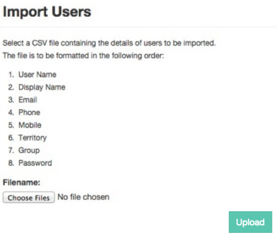 Phocas (default) authentication: The Import tool allows you to upload new users via a CSV text file, for example, based on a Microsoft Excel worksheet. Ensure the data in your file is in the order specified on the Import Users window. You might prefer to download and edit the example file below. Then select your file and click Upload.