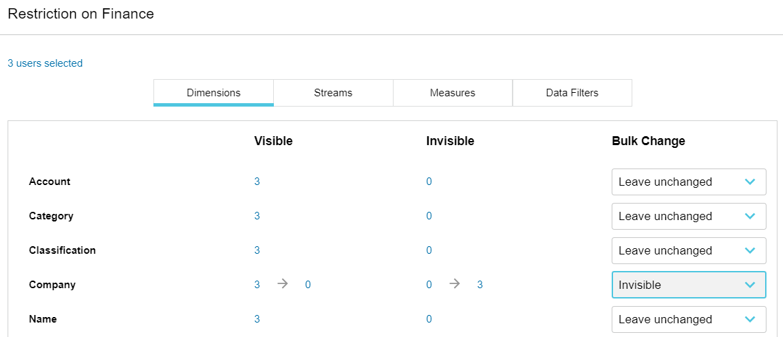 Clear restrictions: Reset all restrictions that were applied to the selected users (regardless of whether you have applied them during this update session or not). This action is the same as selecting Visible from the Bulk Change dropdown list for all items and deleting all filters. In other words, you give the selected users permission to view all the data in the database.