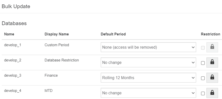 On the next Bulk Update screen, update the database access for the selected users, as required. You can give or remove access and change the default period for each database.