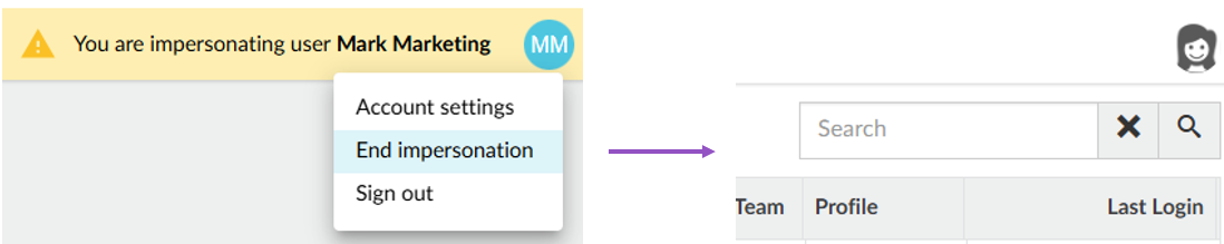 Click the button with the impersonated user's initials or image on it (in the top-right corner of the screen), then select End impersonation. You return to your regular Phocas session.