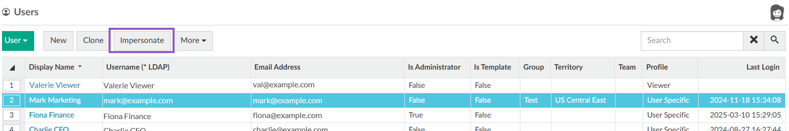 Suppose you're a Phocas administrator and want to impersonate one of your users, Mark Marketing.