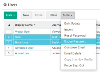 The Expire option is useful when you want multiple users to change their passwords immediately. The next time the selected users sign in to Phocas, they get a message telling them their passwords have expired and they are forced to enter a new password (that they choose themselves).