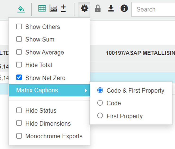 You can customize the headings to display only the code or first property. When the grid is in matrix mode, click the Options button, then click Matrix captions and select the required option: Code & First Property, Code or First Property.