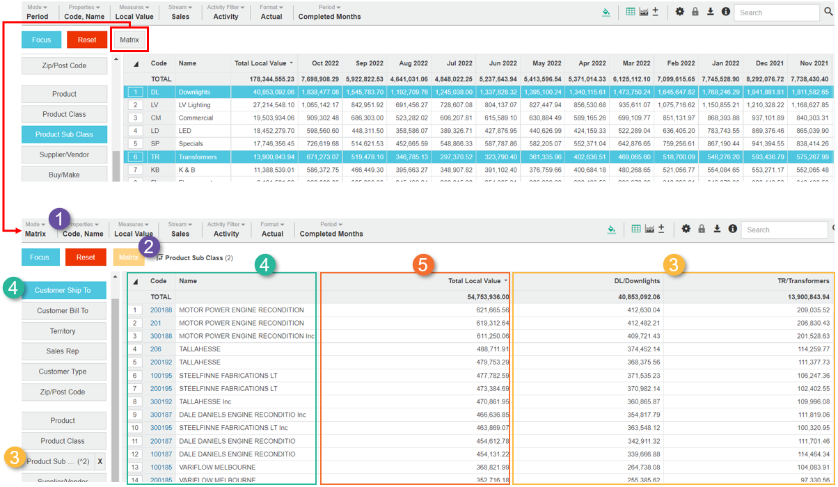 Select the dimension (Product Sub Class), then select the rows* of the entities you want to matrix (Downlights and Transformers products).