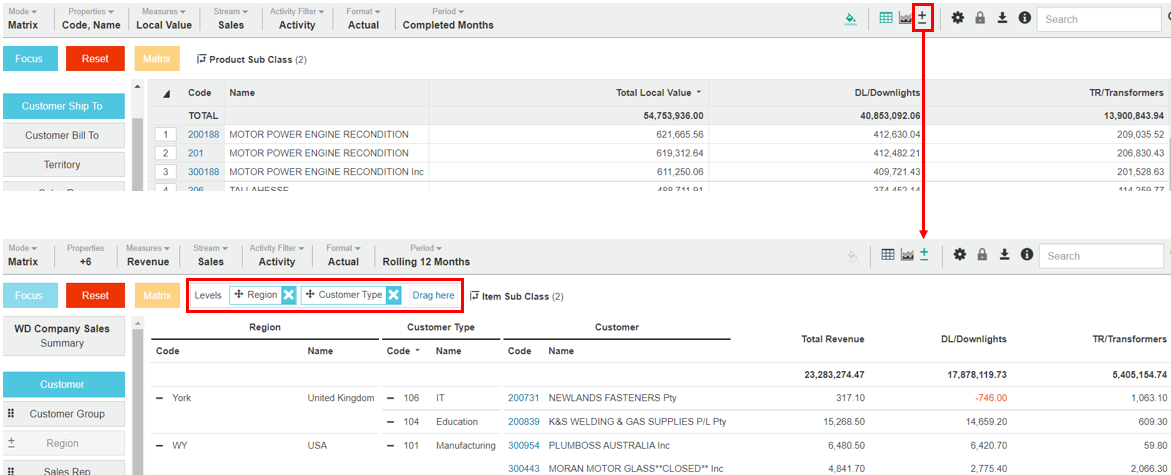 Create your matrix as usual, click the Nest button, then drag the Region and Customer Type dimensions into the Levels box. You can now see two additional levels of detail (region and type) in the grid.