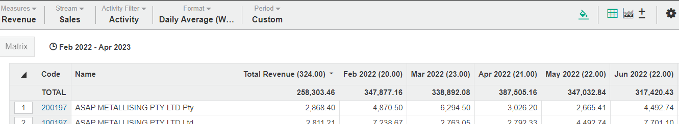 Click Format > Daily Average. In this example, there are no working day calendars to select from*. The grid updates to show the daily average in each month based on the total number of work days in each respective month. The number of work days displays in brackets in each column heading.