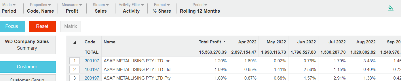 Click Format > % Share. The grid updates to show the percentage share for each customer, with the values in each column adding to 100%.