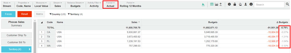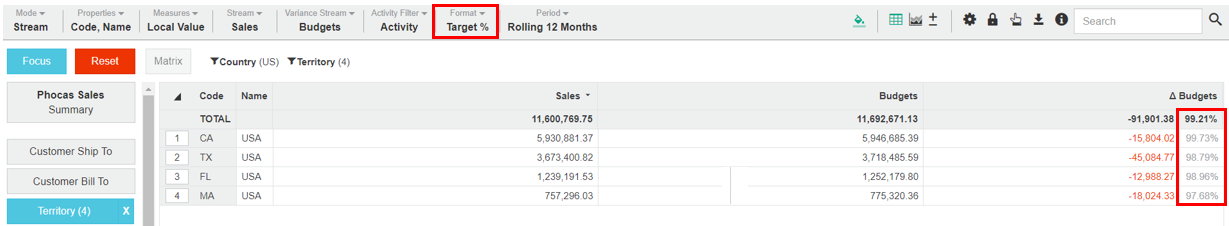 Click Format > Target %. The grid updates to show the target % in the Budgets percentage variance column, giving you a difference perspective on the results. For example, you can now say that California achieved over 99% of its budget.