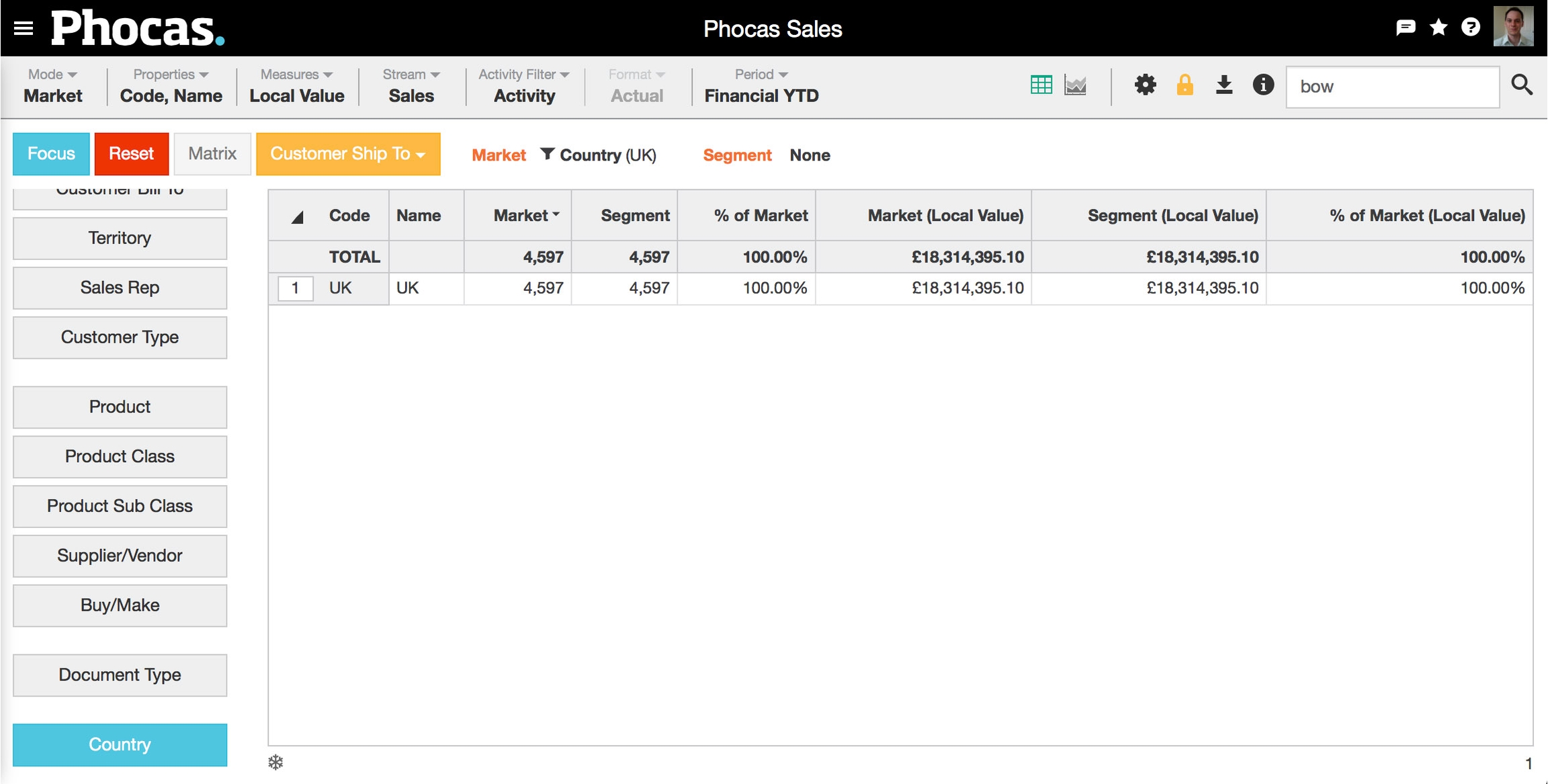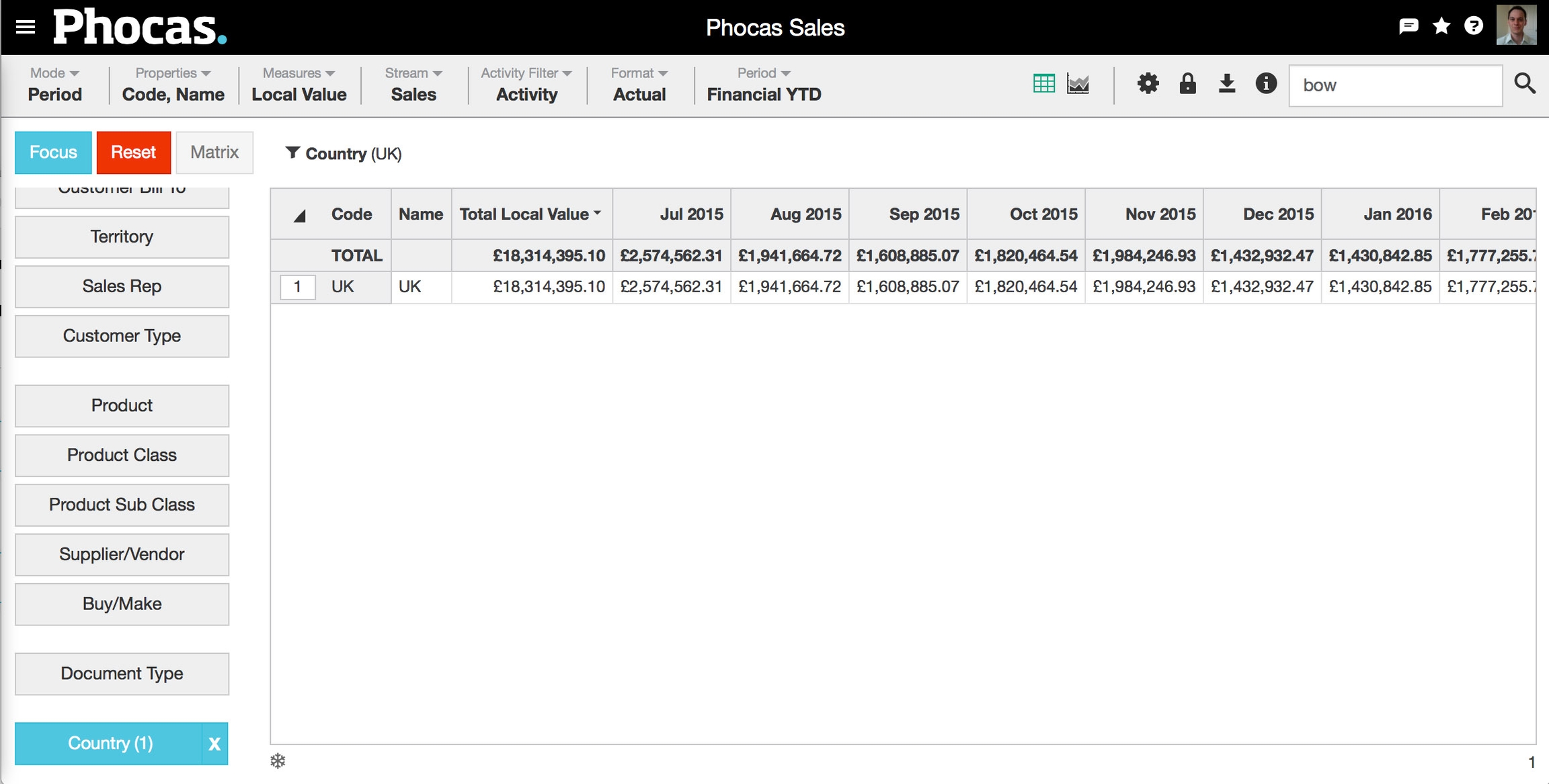 Select the market: Click the Country dimension, select the UK country, then click the Focus button. The grid displays columns for the active properties (such as Code and Name) for that dimension, a Total column, and a column for each time unit in the current period.