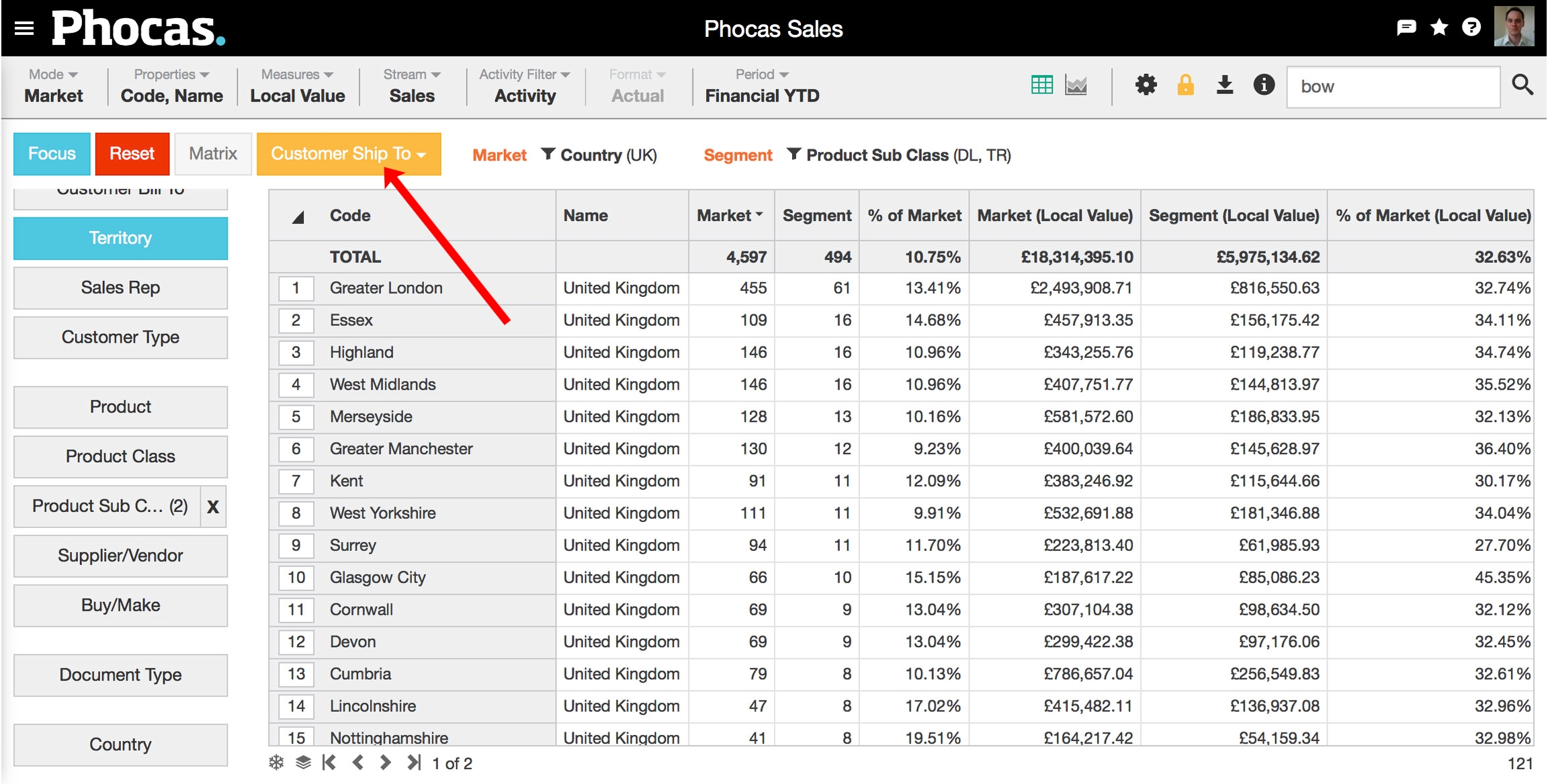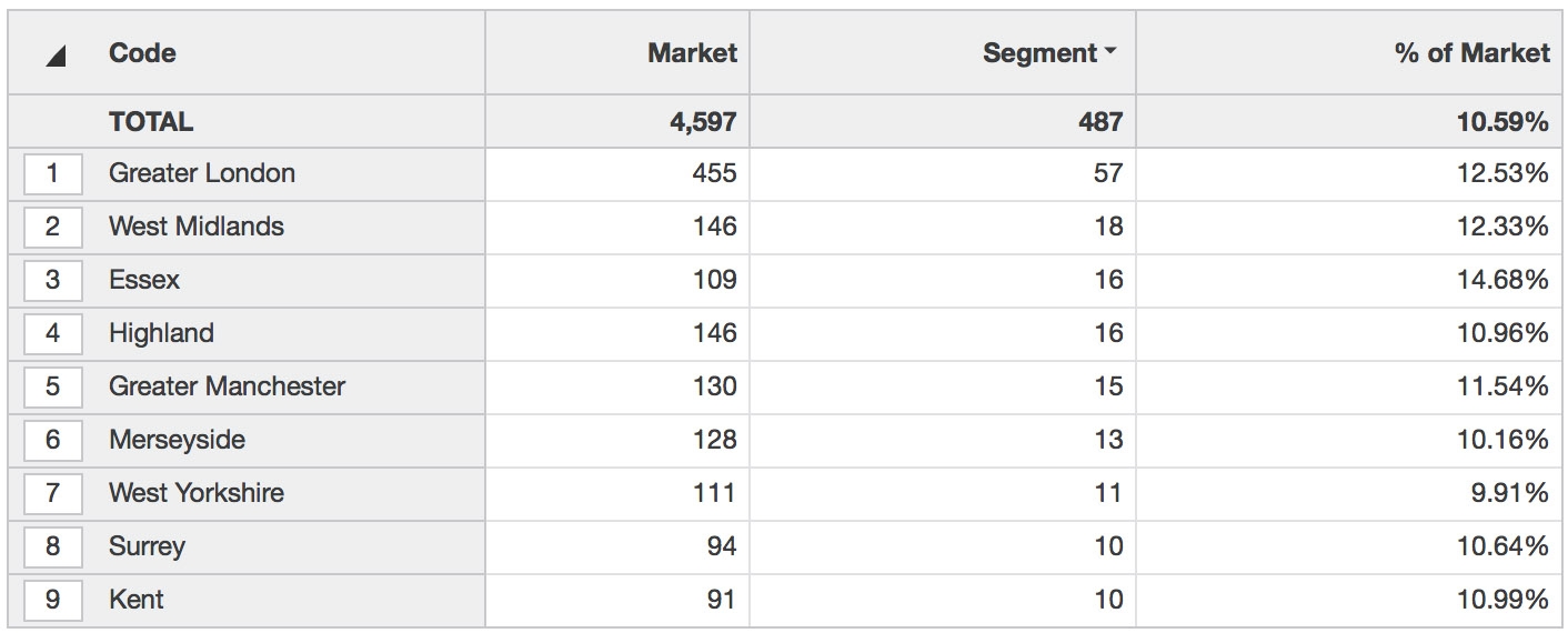 Looking at the first line in the image below, the total market in Greater London is 455 customers but only 57 of those customers are buying this segment (the selected product groups), giving a market penetration of 12.53%. This example uses a count measure but other measures, such as value or quantity, can also be used.