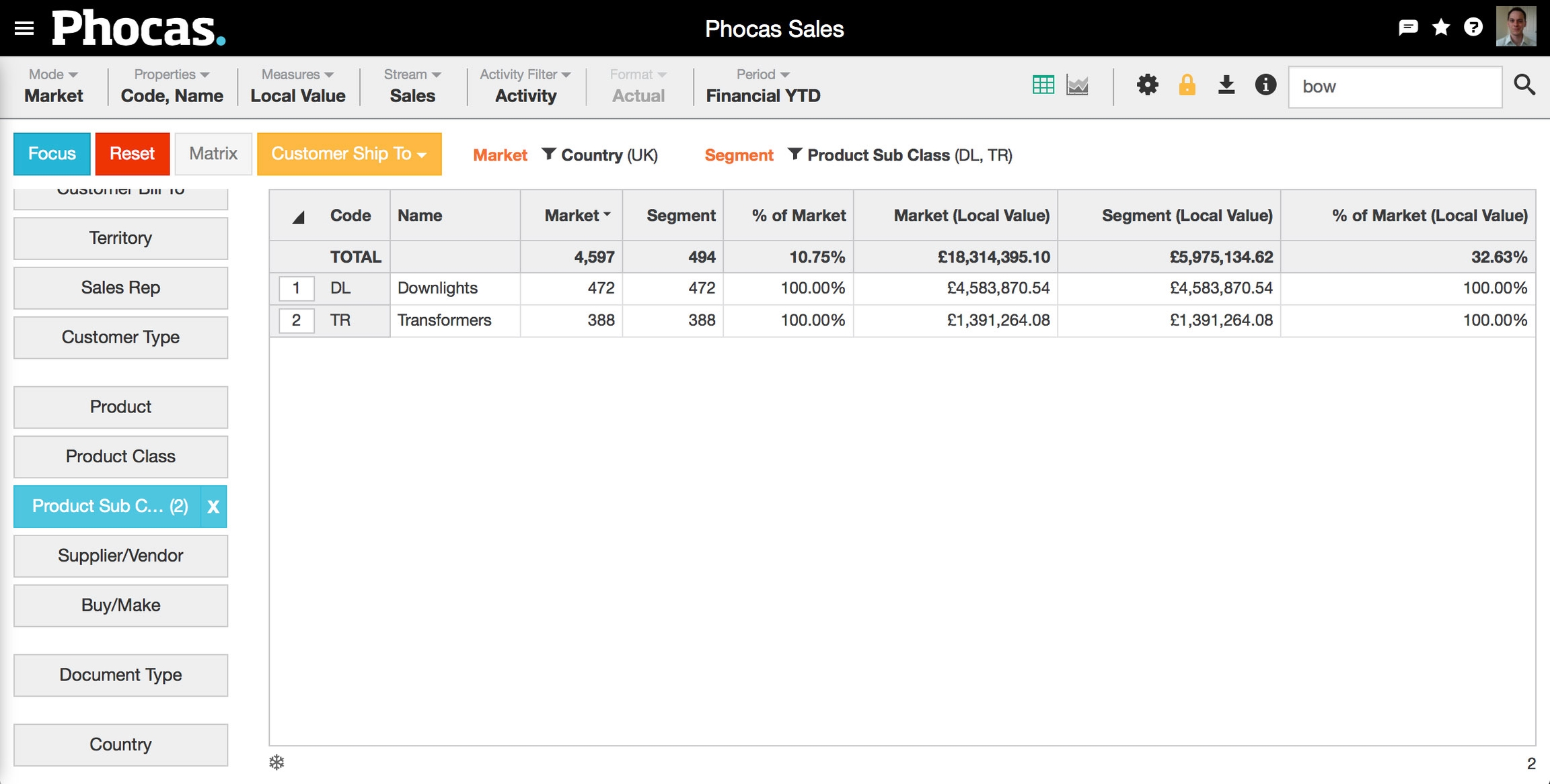 Select the segment: Click the Product Sub Class dimension, select the Downlights (DL) and Transformers (TR) products, then click the Focus button. The selections you made display next to the word Segment in the status bar. The data updates in the Segment and the % of Market columns.