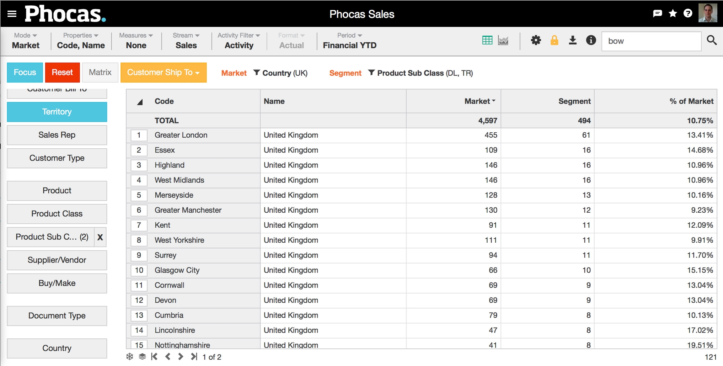 View and analyze the results. For example, you can see that of the 109 customers in Essex, only 16 are purchasing in the selected segments (downlights and transformers).