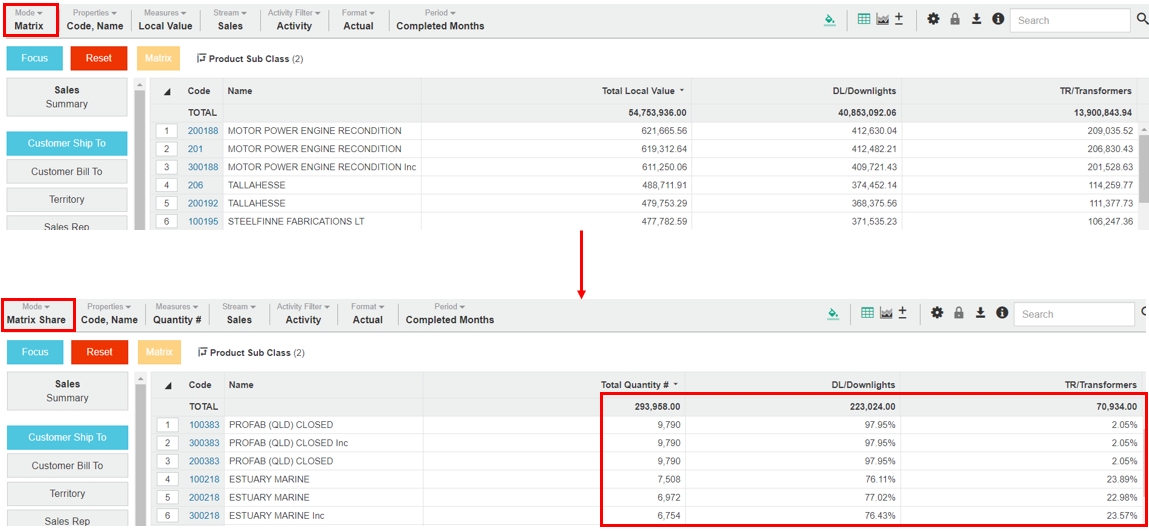 The following example uses Matrix Share mode to identify which customers have bought downlights but not transformers, both this year and last year. Suppose you know that typically one transformer is required to run two downlights. That is, a 33.3% / 66.6% split, based on quantity. You want to identify the customers that are outside that ratio, in other words, which customers are buying fewer transformers than expected.