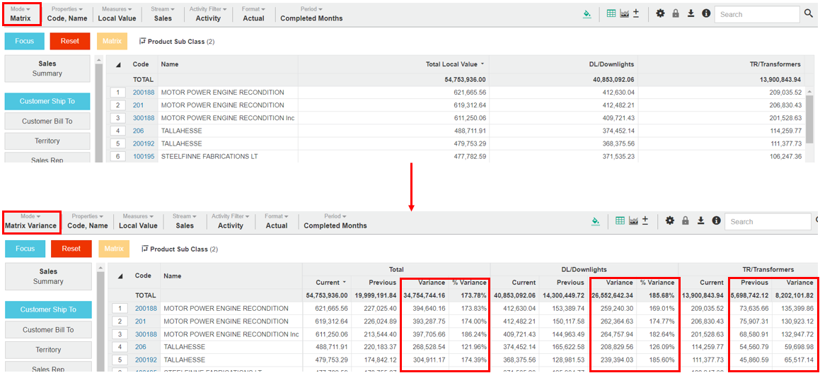 The following example uses Matrix Variance mode to identify which customers have bought downlights but not transformers, both this year and last year: