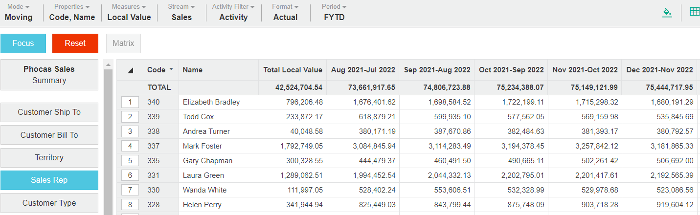 Use Moving mode to view the Sales Rep performance from a moving, annual total perspective: